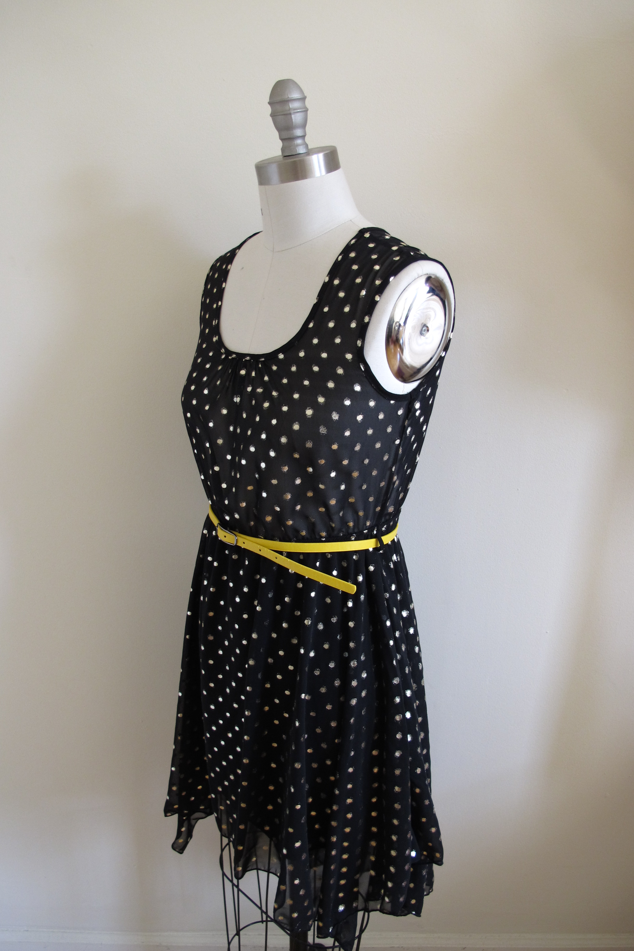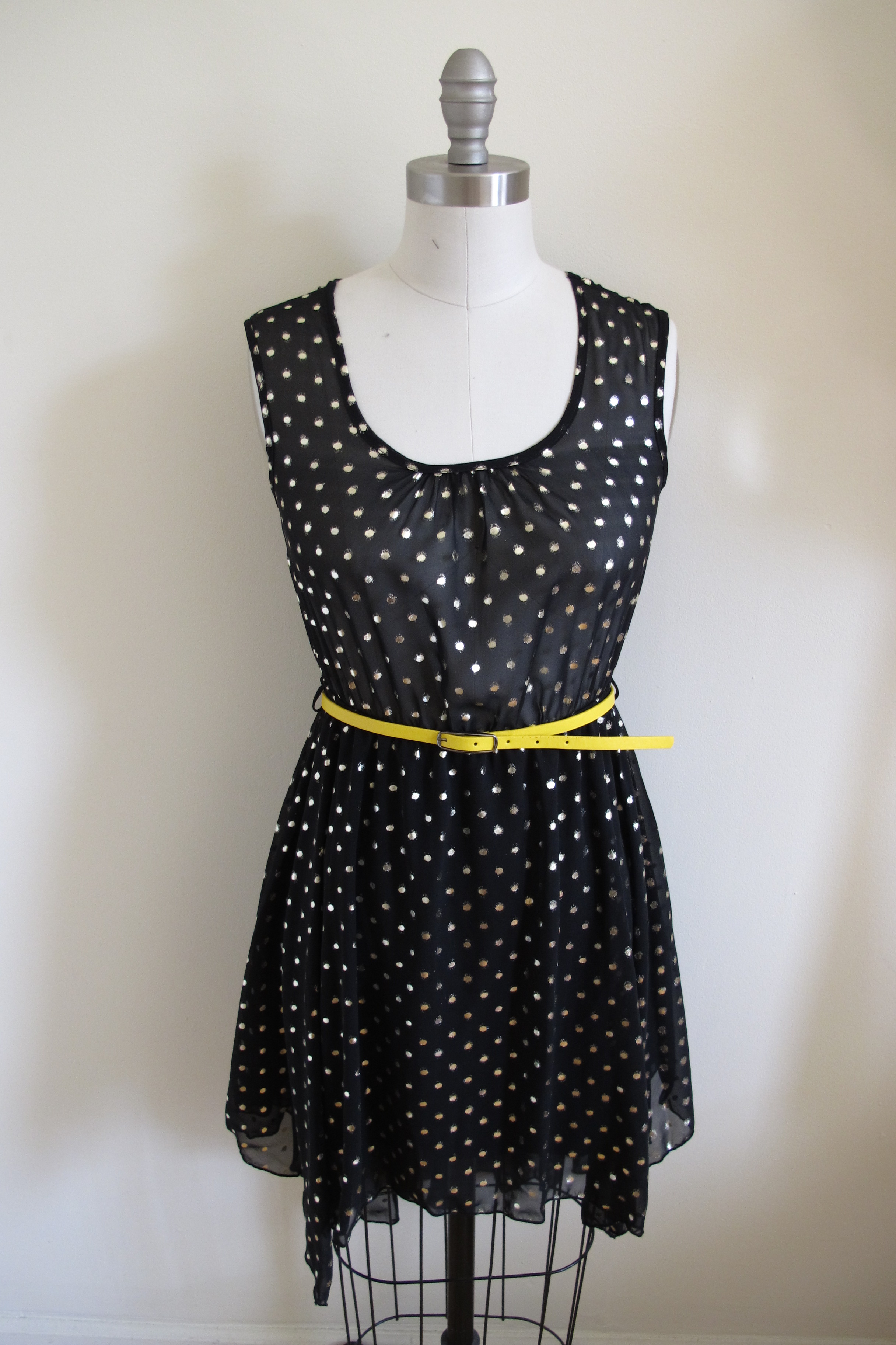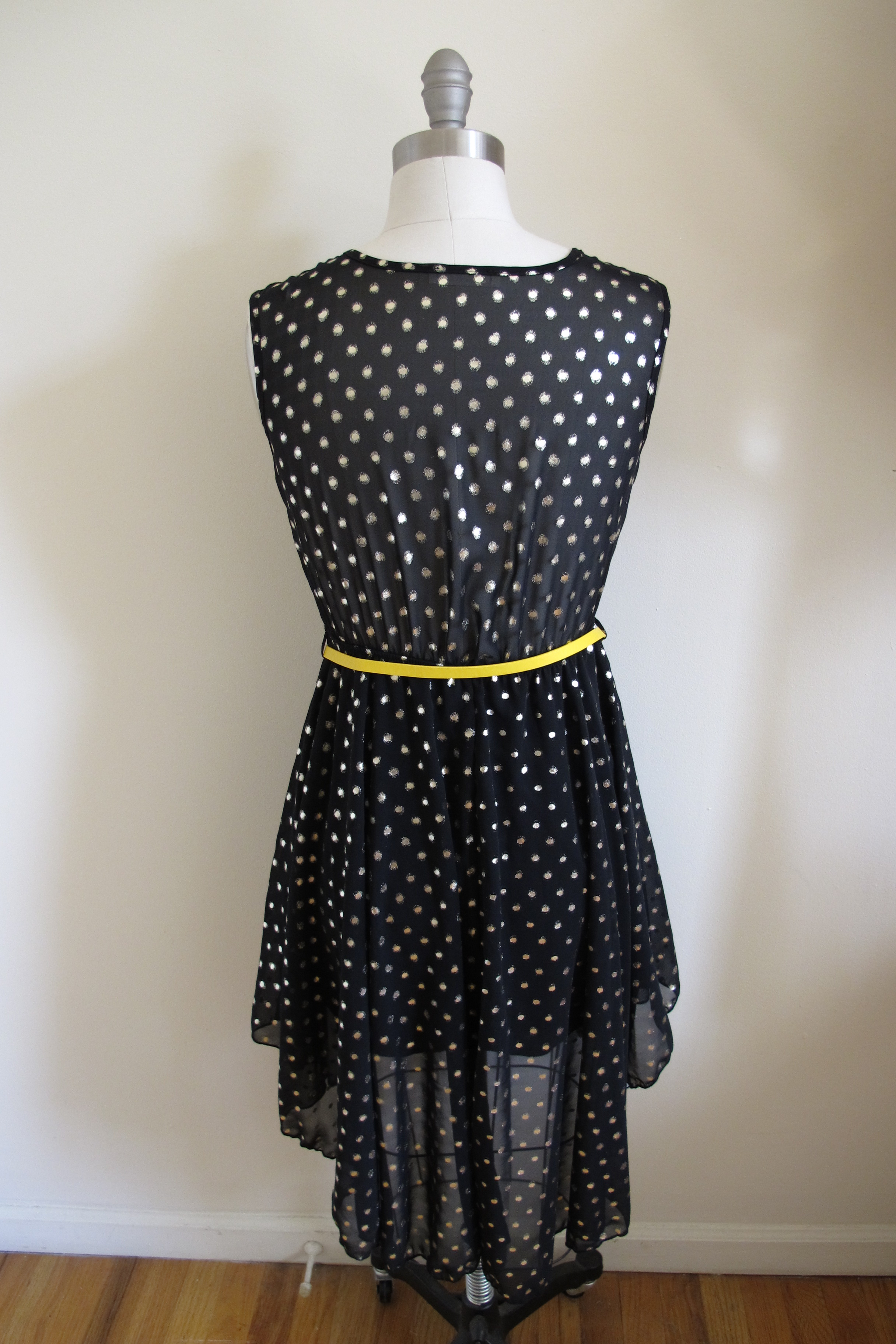 Sleeveless, hi-low hemline dress in sheer black chiffon with silver polka dots. Lined skirt and elastic waist. Comes with yellow belt. Wear it with a cami or bandeau!