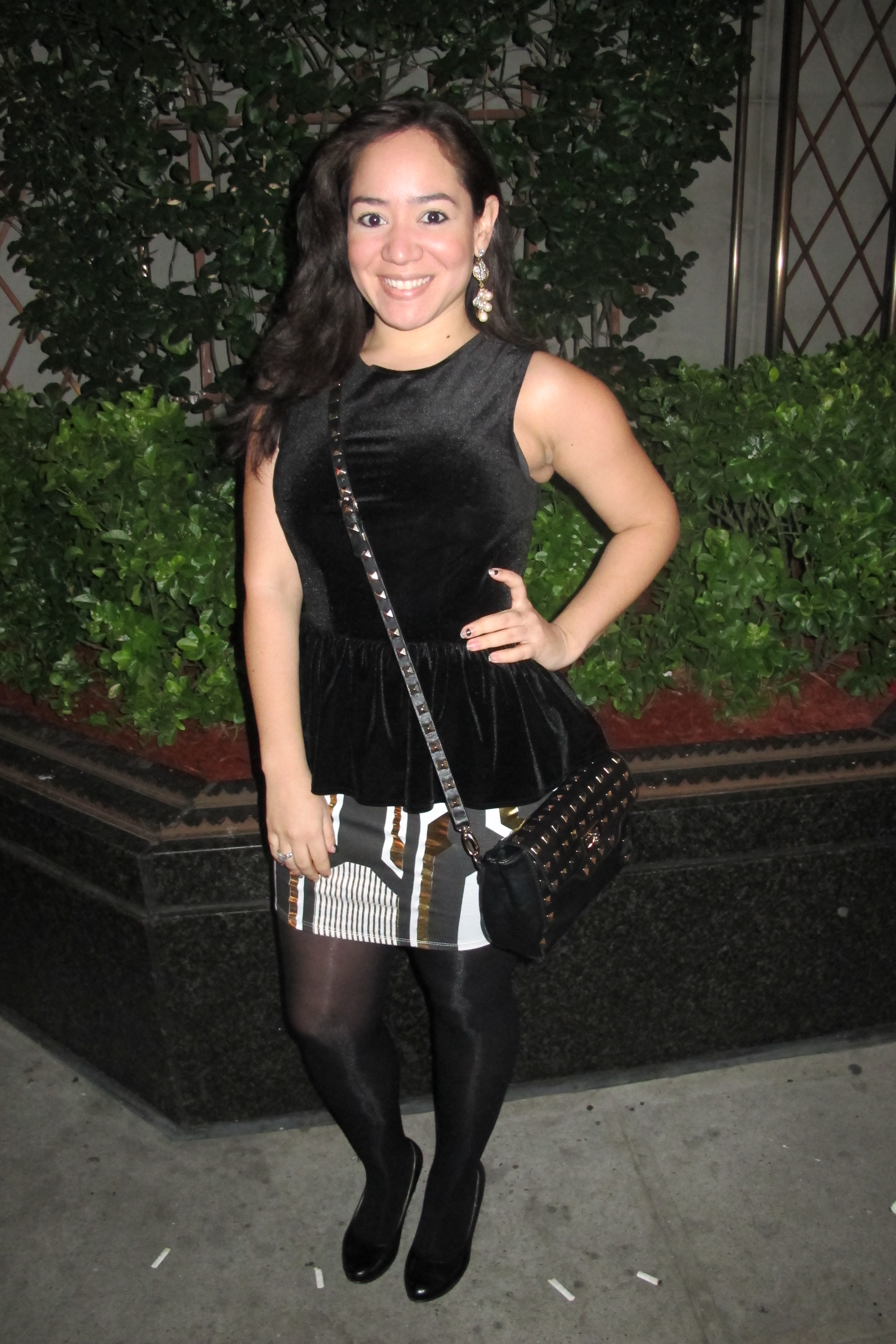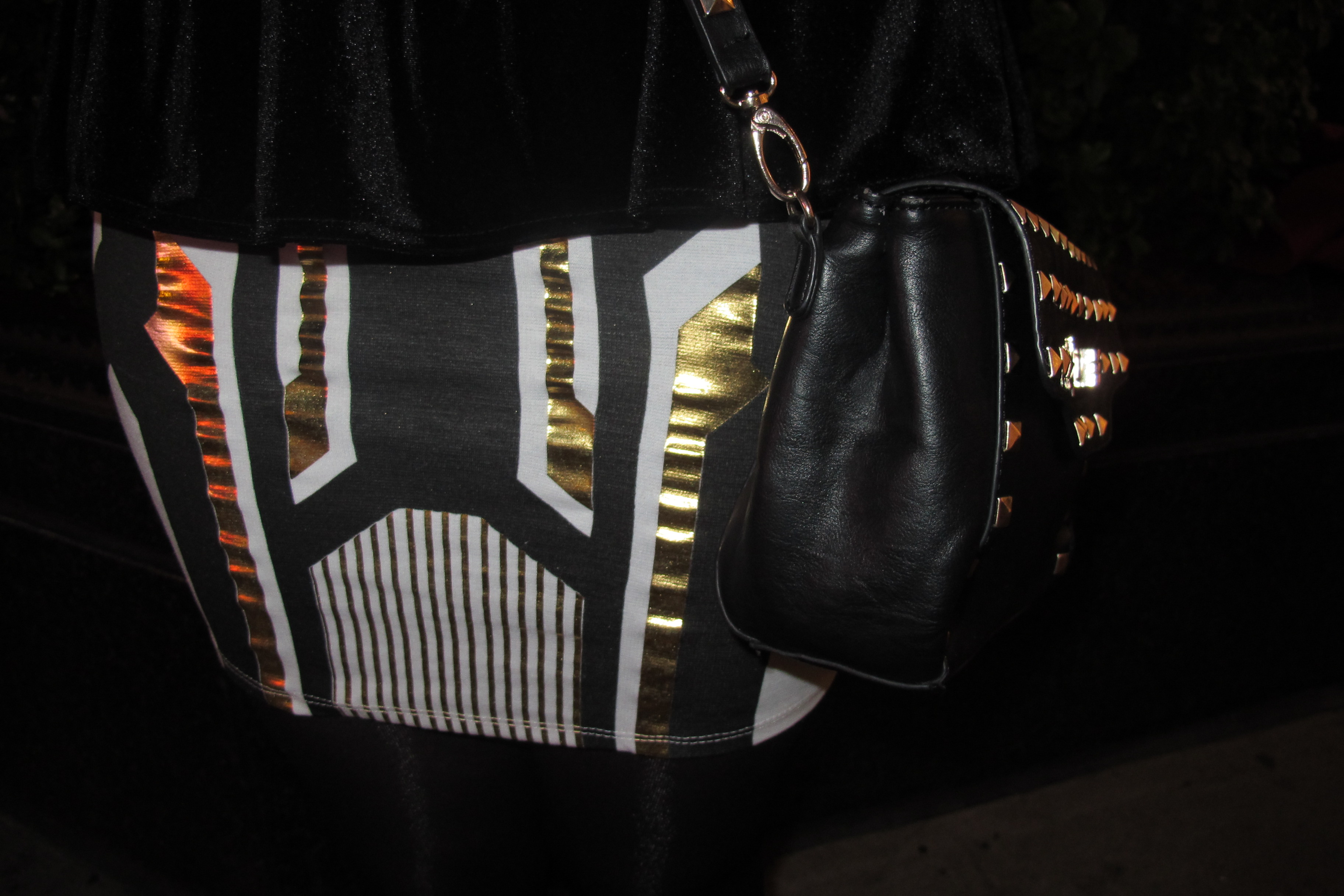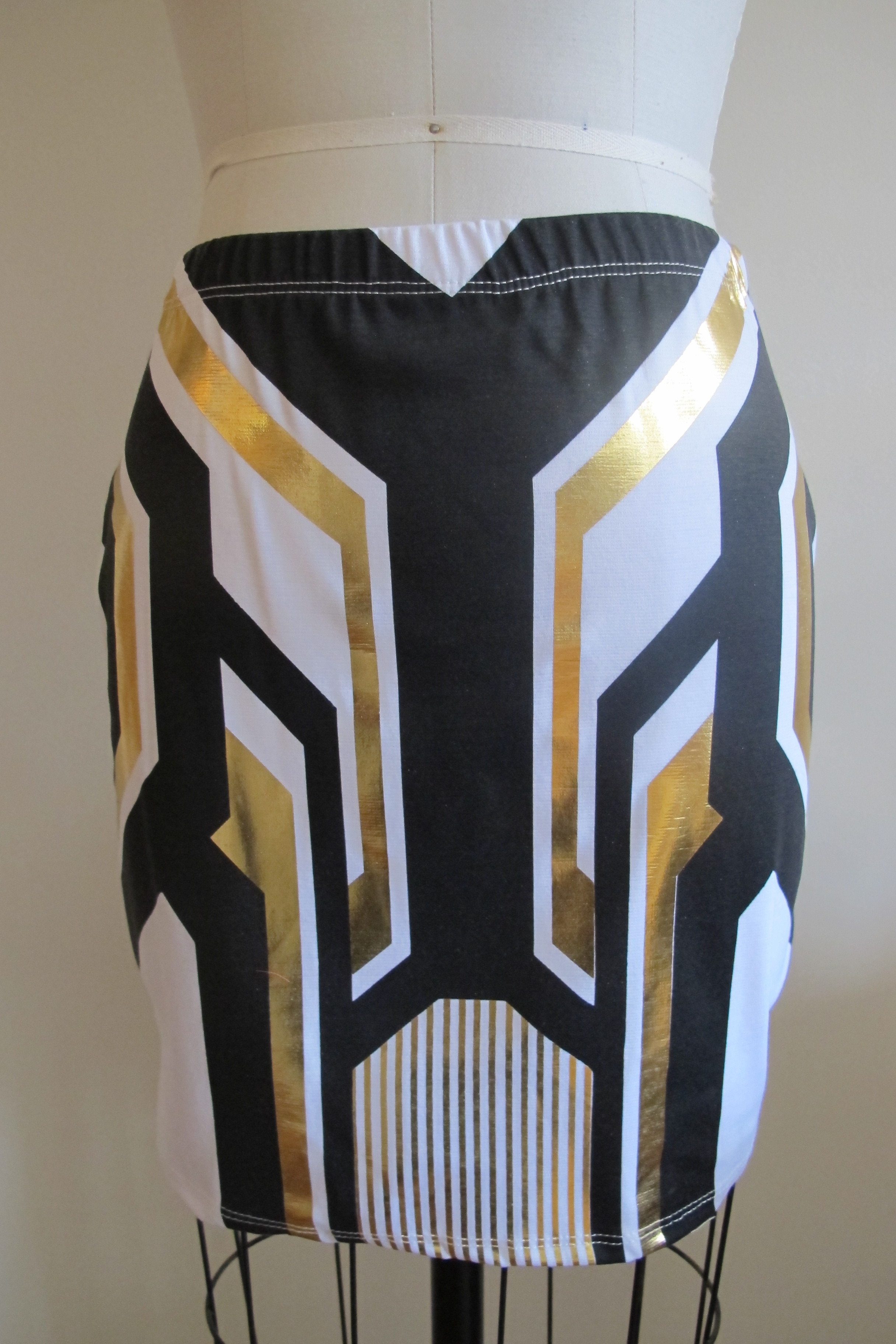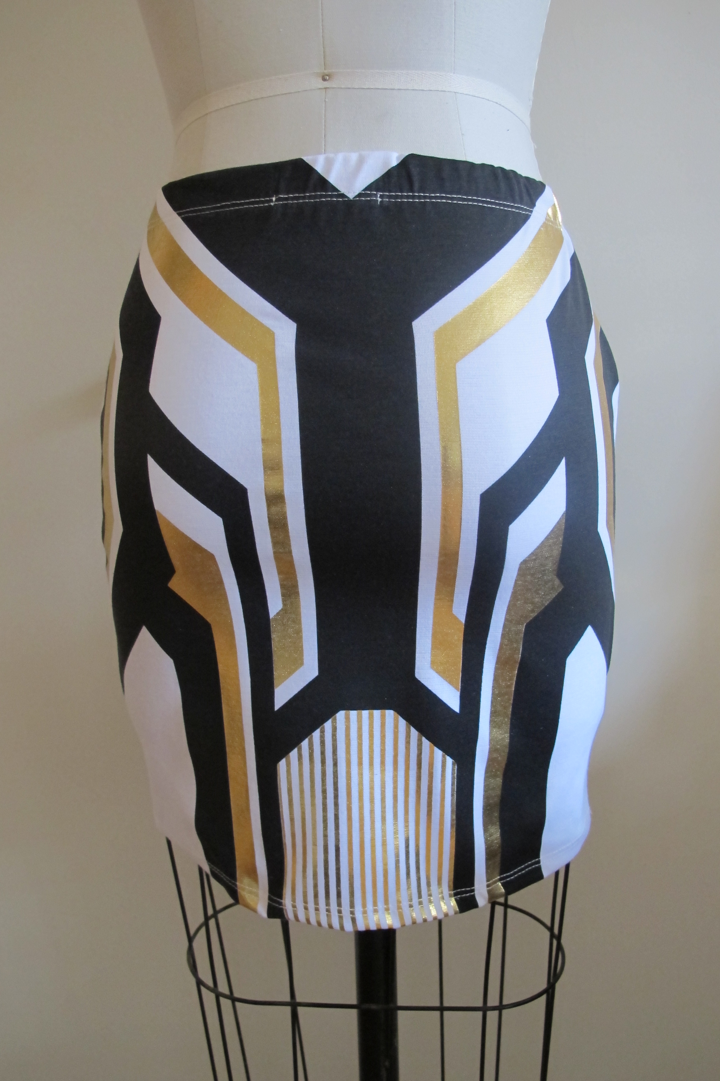 Stretch cotton short skirt in white with gold and black geometric print.